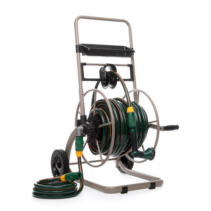 The hose cart is easy to manoeuvre and conveniently store away when not in use. The added bonus of the handy shelf is perfect for storing small watering accessories.