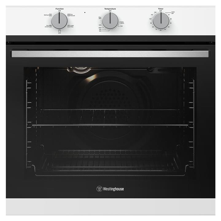 Westinghouse WVE612WCP Oven 2 hour auto-off oven timer Easy guide side racks Cooler to Touch Doors Operates on a standard 10A power supply 80L gross capacity oven Plug and play with 10A socket Fingerprint resistant stainless steel Domestic warranty details (yrs): 2 Type of Oven: single oven Oven fuel: electric Materials/Colour: white Controls of Oven: control knob Cooling fan: Yes Gross capacity litres: 80 Useable capacity litres: 72 Oven function: multifunction Number of functions: 5 Oven Functions: grill,fan grill,defrost,light,fan forced cooking Oven liner: pyrolux high temperature enamel Timer functions: Auto off ,Ringer Light wattage: 25